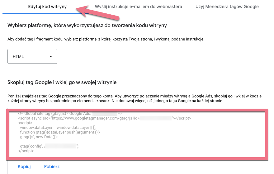 1. W Google Ads skopiuj tag z zakładki Edytuj kod witryny.