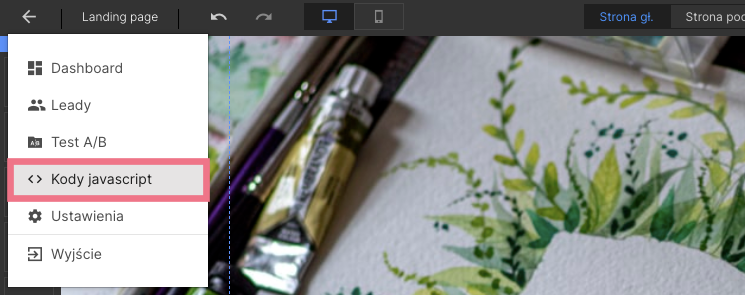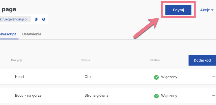 8. Otwórz nową kartę przeglądarki i przejdź do Landingi. Zaloguj się i przejdź do edytora swojego landing page’a. W kolejnym kroku zainstalujesz dwa kody JavaScript – globalny tag witryny oraz kod zdarzenia.