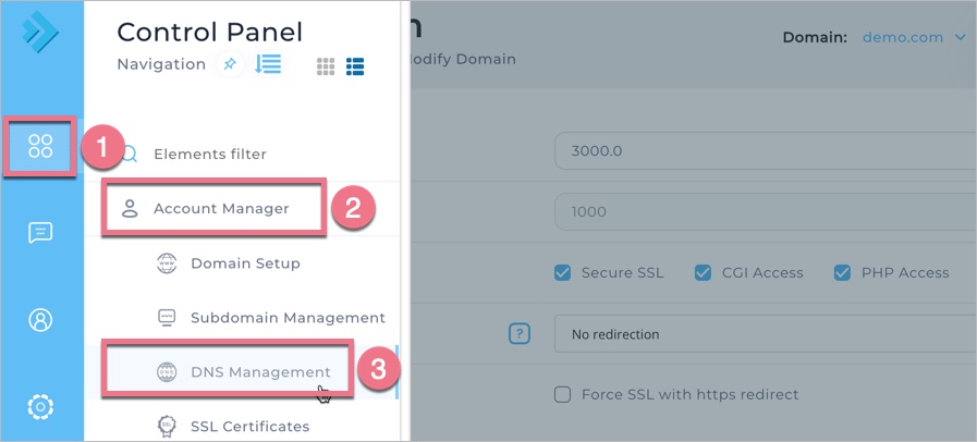3. Przejdź do sekcji Account Manager i wejdź w zakładkę DNS Management.