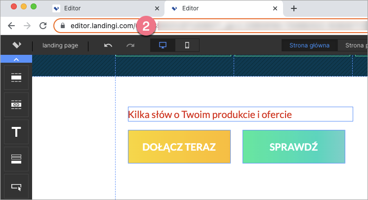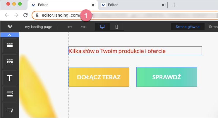 1. Zaloguj się na swoje konto w Landingi i przejdź do edytora pierwszego landing page’a, pop-upu lub lightboxa.