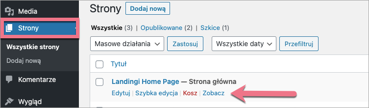 4. Przejdź do zakładki Strony i upewnij się, że landing page widnieje na liście jako Strona główna. Kliknij w Zobacz i sprawdź, czy strona wyświetla się prawidłowo.