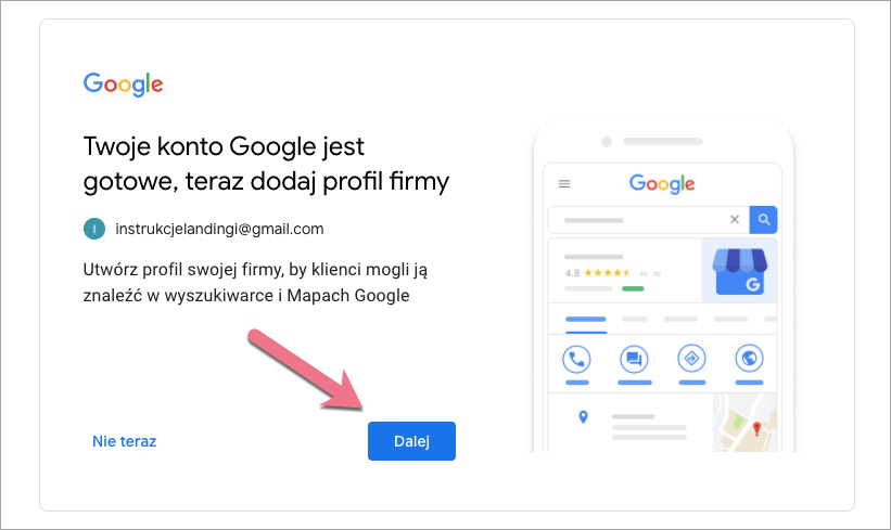 3. Po zakończeniu tworzenia konta wybierz Dalej i utwórz profil firmy.
