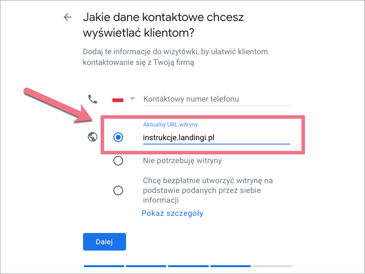 3. W kroku 4 wklej adres URL landing page’a. Wybierz Dalej i dokończ konfigurację konta.