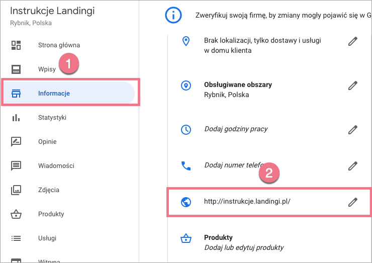 Adres URL możesz zmienić w dowolnym momencie. Zaloguj się na swoje konto Google Moja Firma. Przejdź do zakładki Informacje (1), przewiń w dół, znajdź pole URL (2) i wklej nowy adres URL.