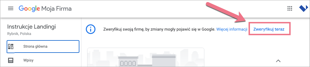 Po otrzymaniu kartki z kodem weryfikacyjnym zaloguj się na swoje konto Google Moja Firma i kliknij Zweryfikuj teraz.