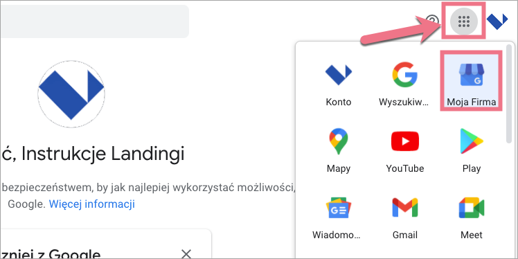 Ustawienia wizytówki Twojej firmy możesz zmienić w każdym momencie. Zaloguj się na swoje konto Google, w prawym górnym rogu kliknij Aplikacje Google i wybierz Moja Firma.