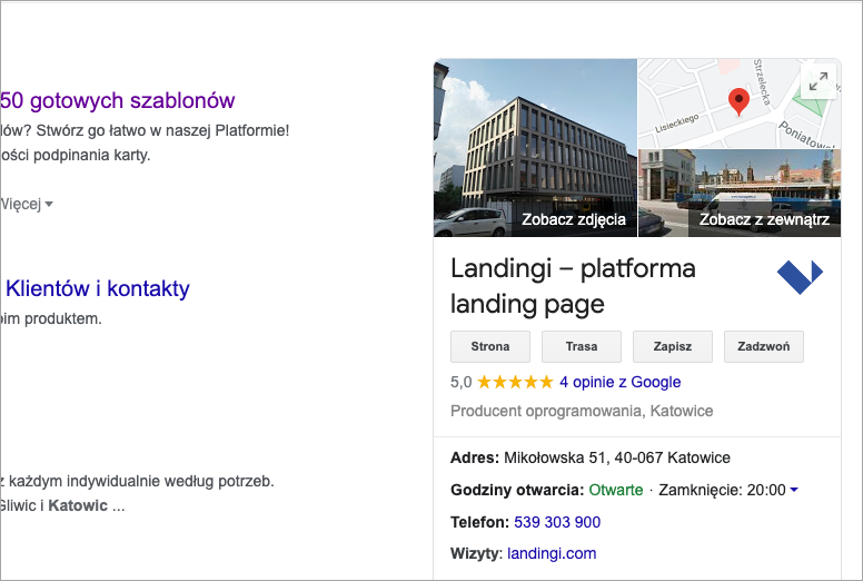 Google Moja Firma to bezpłatne narzędzie, które umożliwia zarządzanie sposobem, w jaki Twoja firma pojawia się w różnych produktach Google, takich jak Mapy Google i wyszukiwarka. Zapewnij klientom łatwy i szybki dostęp do aktualnych i najważniejszych informacji dzięki wizytówce Twojej firmy. Jeśli nie masz strony internetowej swojej firmy, możesz łatwo połączyć landing page’a z profilem Google Moja Firma.