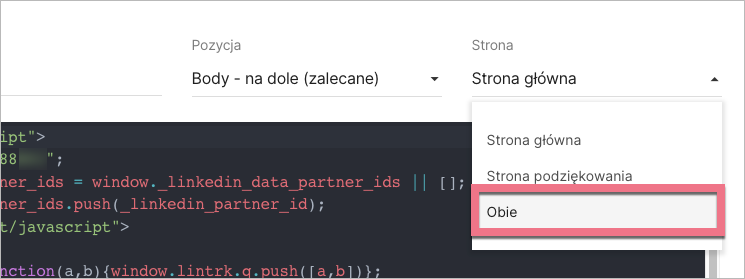 Pamiętaj, że aby LinkedIn Insight Tag mógł zadziałać również na stronie podziękowania, musisz go w kodach JavaScript dodać do obu stron.