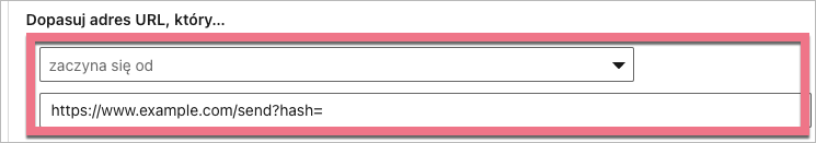 7. Jeżeli chcesz śledzić konwersję na stronie podziękowania i korzystasz z naszej domyślnej strony podziękowania z dynamicznym adresem URL (zmieniającym się hashem), wybierz opcję zaczyna się od i wpisz adres w formacie https://example.com/send?hash=, zamieniając example.com na swój adres.