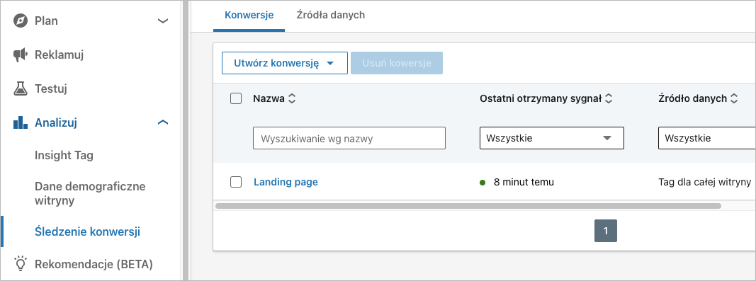 6. W sekcji Konwersja wczytania strony wpisz adres URL landing page’a, na którym chcesz śledzić konwersje. Następnie kliknij Utwórz.