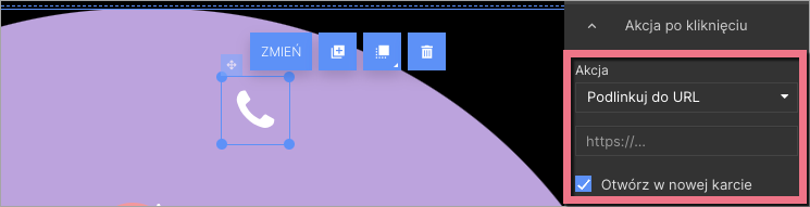 2. Kliknij na ikonę lub obrazek. W panelu po prawej stronie odszukaj zakładkę Akcja po kliknięciu i rozwiń menu Akcja.