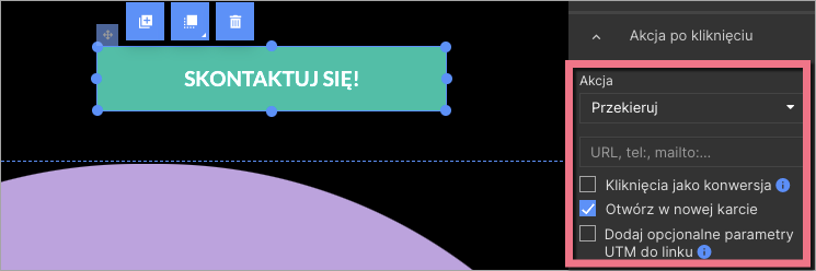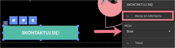 2. Kliknij na wybrany przycisk. W panelu po prawej stronie odszukaj zakładkę Akcja po kliknięciu i rozwiń menu Akcja.