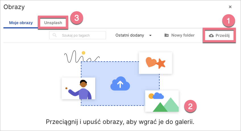 2. Wgraj swoją grafikę: kliknij Prześlij (1) i dodaj pliki; przeciągnij pliki bezpośrednio z komputera i upuść w edytorze (2); lub wgraj obrazy z Unsplash (3).