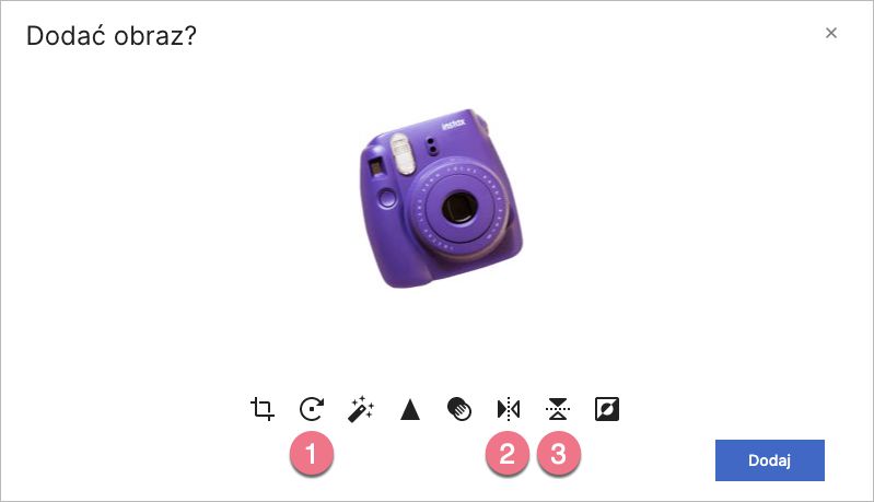 4. Zobaczysz okno edycji. Możesz w nim m.in. obrócić obraz (1), odbić go pionowo (2) lub poziomo (3). Aby zapisać zmiany, kliknij Dodaj.