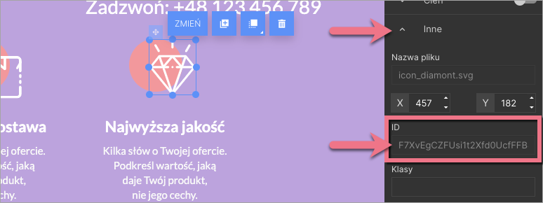 2. Odszukaj element, który chcesz obrócić. Kliknij w niego i z zakładki Inne po prawej stronie skopiuj numer ID.