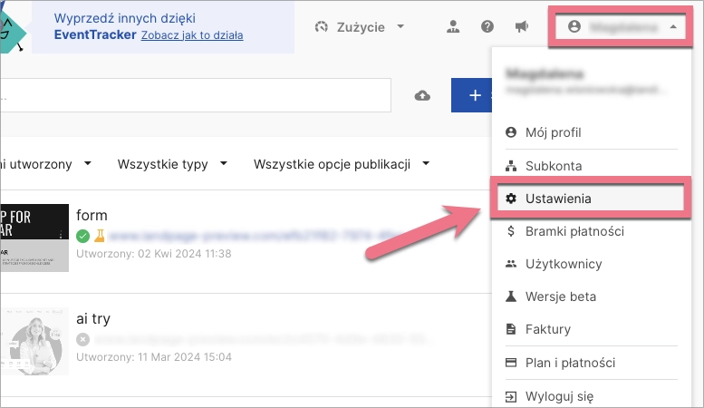 1. Zaloguj się na swoje konto w Landingi, kliknij nazwę swojego profilu i wybierz Ustawienia.