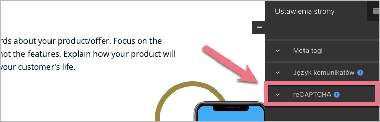 1. Możesz zmienić pozycję ikony dla danego landing page’a w jego Ustawieniach strony. W edytorze znajdź zakładkę reCAPTCHA w menu po prawej stronie i rozwiń ją.