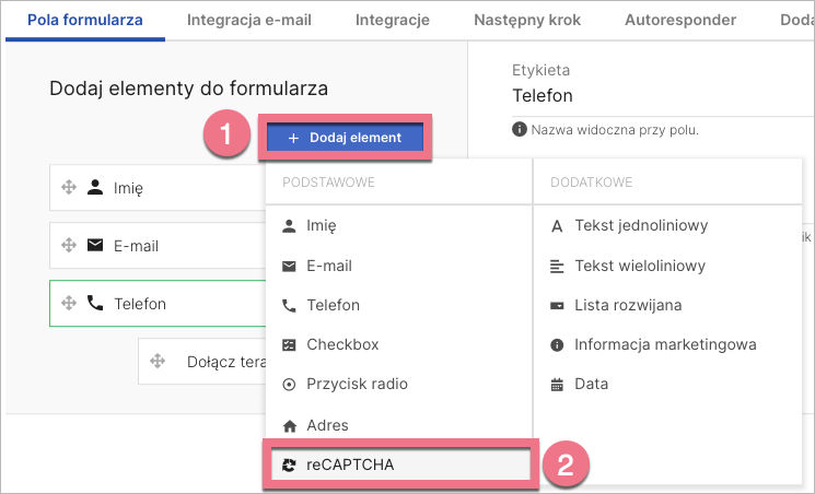 2. Wejdź w Pola formularza, kliknij Dodaj element (1) i wybierz reCAPTCHA (2).