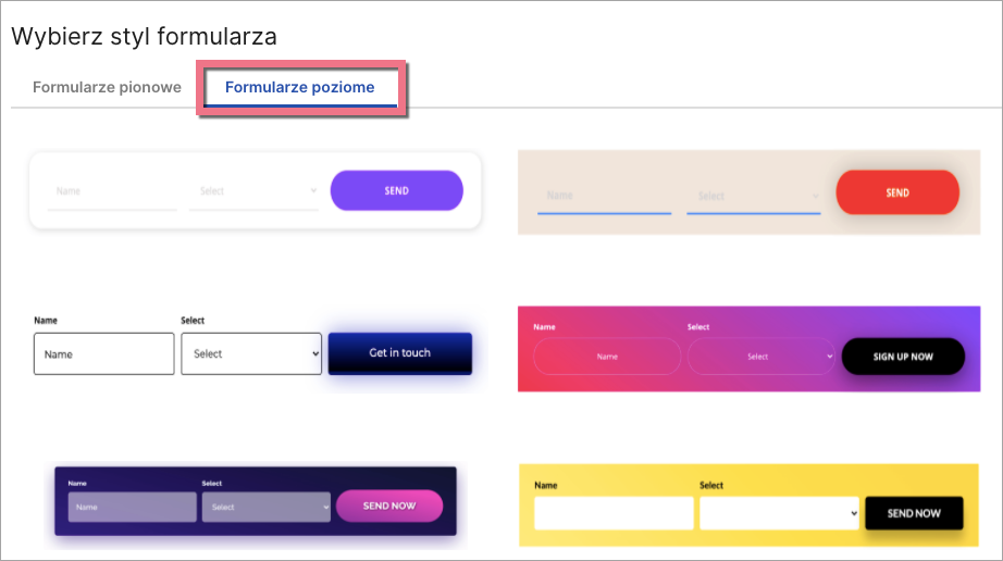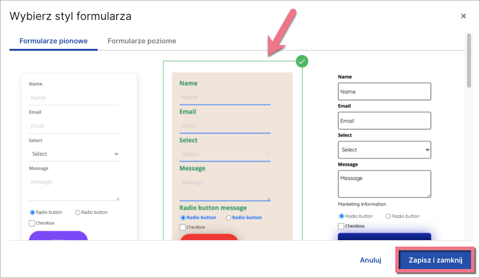 Kliknij Style formularza w panelu bocznym. Wybierz gotowy projekt formularza i kliknij w niego dwa razy lub kliknij Zapisz i zamknij. Możesz wybrać formularz pionowy lub poziomy.