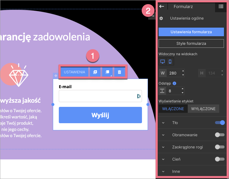 Do ustawień formularza przejdziesz z menu podręcznego (1) lub panelu bocznego (2).