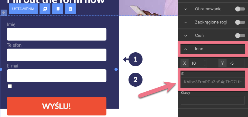 Do korzystania z niektórych integracji będziesz potrzebować numeru ID formularza. Aby go znaleźć, kliknij w formularz w edytorze i przejdź do panelu po prawej stronie. Rozwiń zakładkę Inne i skopiuj ID.