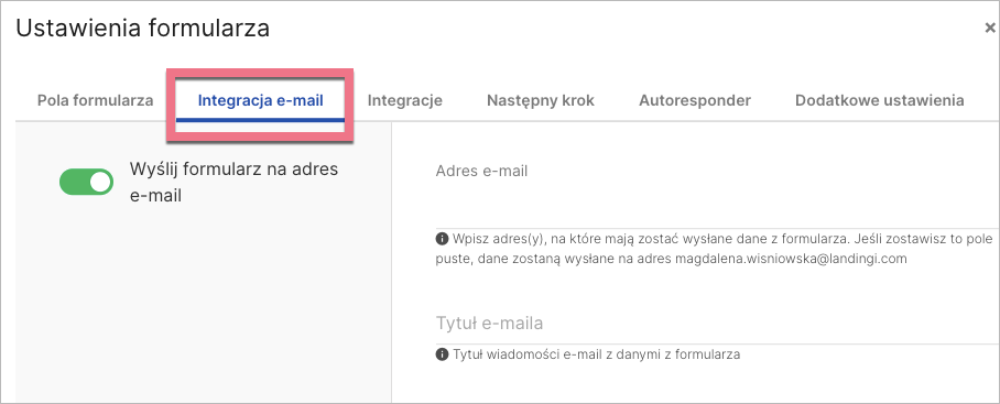 Jeżeli chcesz połączyć formularz na landing page’u z adresem e-mail, skorzystaj z osobnej integracji e-mail dla formularza.