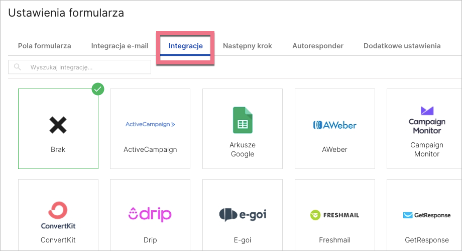 Jeśli korzystasz z zewnętrznych narzędzi i chcesz je zintegrować z formularzem na swoim landing page’u, możesz to zrobić, przechodząc do zakładki Integracje. Znajdziesz tutaj integracje wewnętrzne, jednak liczba narzędzi, z którymi możesz połączyć Landingi jest znacznie większa – aby dowiedzieć się więcej o integracjach kompatybilnych i integracjach przez Zapiera, przejrzyj nasz katalog integracji.