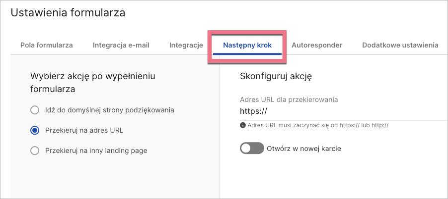 Możesz określić, jaka akcja ma wystąpić po wypełnieniu formularza: przejście do domyślnej strony podziękowania, przekierowanie na dowolny adres URL lub inny landing page. Dowiedz się więcej o funkcji Następnego kroku.