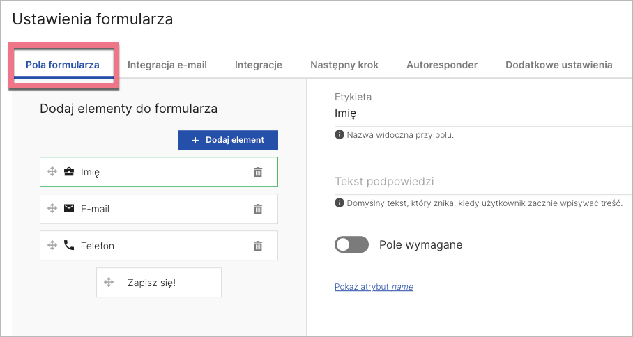 Możesz dodać do formularza własne pola lub pola predefiniowane, klikając w przycisk + Dodaj element. Klikając kolejno w wybrane pole po lewej stronie, zobaczysz jego ustawienia po prawej. Zakres ustawień zmienia się w zależności od wybranego elementu.