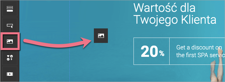 Po lewej stronie edytora odszukaj widget Obrazek, następnie przeciągnij go i upuść w obszar aktywny Twojego landing page’a.