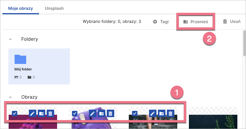 Nowe obrazy możesz dodawać do folderów w taki sam sposób jak do galerii ogólnej. Możesz też zaznaczyć już dodane grafiki (1), kliknąć Przenieś (2) i wybrać folder docelowy.