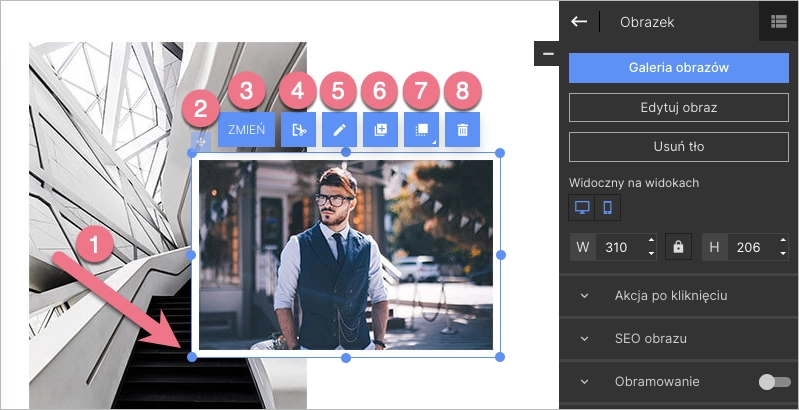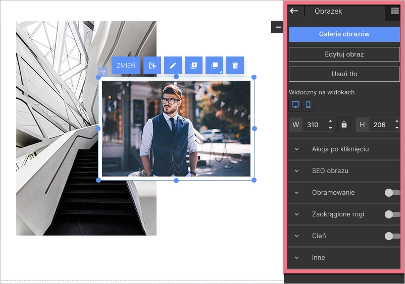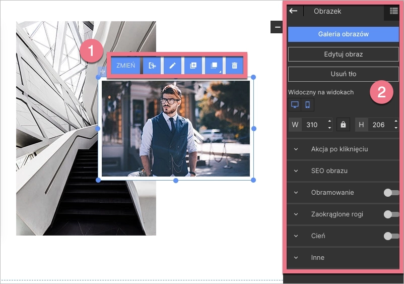 W panelu bocznym możesz przejść do galerii i zmiany obrazka, jego edycji, automatycznego usuwania tła, dostosować widoczność (obrazek jest domyślnie widoczny zarówno na widoku desktopowym, jak i mobilnym) i zmienić jego rozmiar.