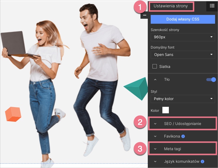 2. Przejdź do panelu po prawej stronie edytora. Opcje SEO oraz miejsce na dodanie meta tagów znajdziesz w zakładce Ustawienia strony.