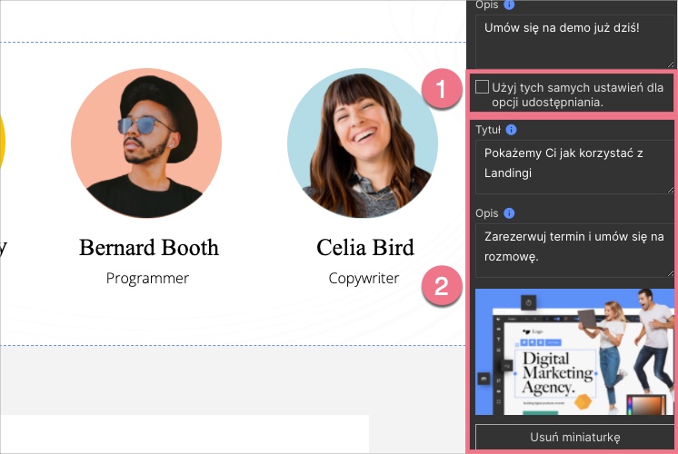 Możesz wybrać opcję Użyj tych samych ustawień dla opcji udostępniania (1), a tytuł i opis będą takie same dla wyników wyszukiwania i platform społecznościowych, lub możesz dodać inny tytuł i opis (2).
