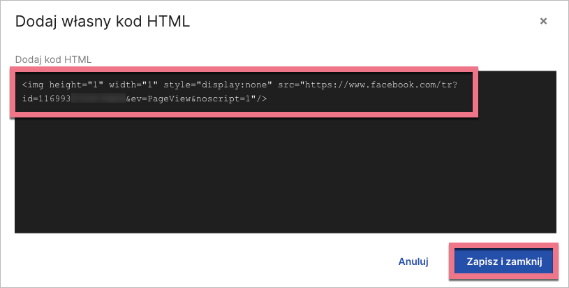 4. Wklej część skryptu głównego piksela – jego adres URL. Następnie Zapisz i zamknij.