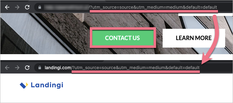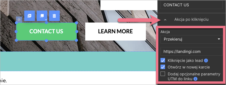 Przekazywanie parametrów UTM jest możliwe przez wszystkie przyciski na landing page’u lub przez konkretny przycisk.