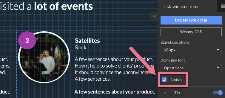 2. Aby włączyć siatkę, w panelu bocznym po prawej stronie edytora przejdź do zakładki Ustawienia strony i zaznacz opcję Siatka. Elementy będą przesuwane do krawędzi siatki.