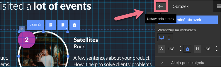 W trakcie edycji możesz wrócić do Ustawień strony, klikając w strzałkę:
