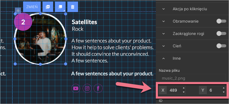 3. Elementy możesz również układać, przesuwając ich wartość na osi X (linia pozioma) oraz Y (linia pionowa) w prawym panelu opcji elementów.