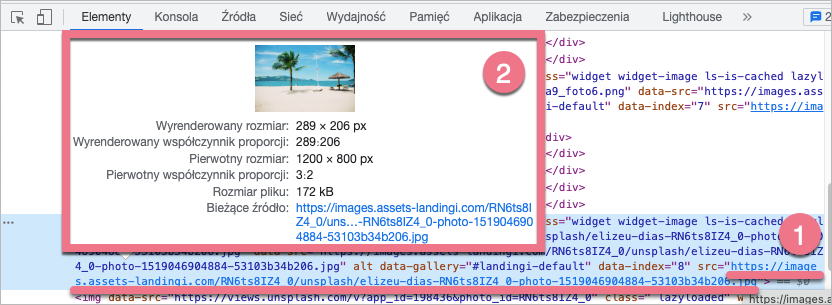 3. Najedź kursorem na link src (1). W wyskakującym okienku (2) zobaczysz link (bieżące źródło) do oryginalnego (pierwotnego) obrazu. Skopiuj go.