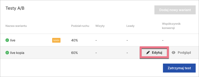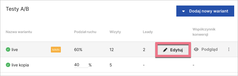 2. Stwórz wariant landing page’a do testu A/B/x i przejdź do jego edytora.