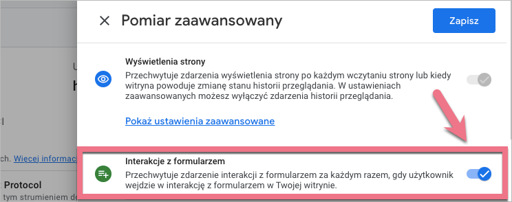 Upewnij się, że w ustawieniach Pomiaru zaawansowanego w GA4 masz włączoną opcję Interakcji z formularzem.