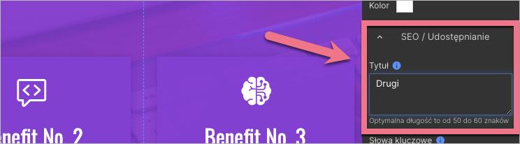 2. W Ustawieniach strony rozwiń zakładkę SEO / Udostępnianie i w polu Tytuł wpisz unikalny tytuł dla tego wariantu landing page’a. Po zmianach opublikuj landing page’a.