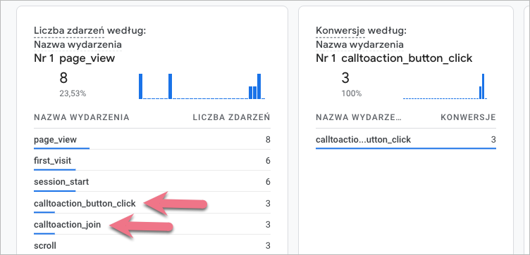 6. Od teraz Twój Google Analytics 4 będzie śledzić dwa zdarzenia kliknięcia przycisku. Pierwsze dane w GA4 zobaczysz od razu w sekcji Raporty > Czas rzeczywisty > Liczba zdarzeń.