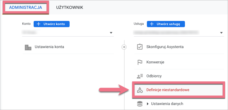 1. Przejdź do Administracji i w usłudze swojego kontenera wybierz Definicje niestandardowe.