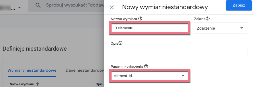 2. Utwórz nowy wymiar niestandardowy. Nadaj (dowolną) nazwę. Jako parametr zdarzenia wpisz dokładnie taką samą nazwę jak w konfiguracji tagu – w naszym przykładzie jest to element_id.