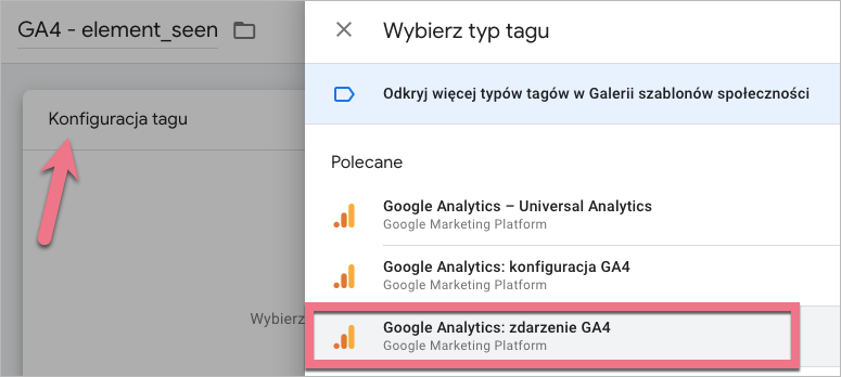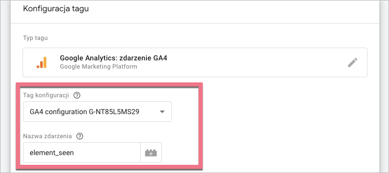 9. W polu Tag konfiguracji wybierz tag stworzony w pierwszym kroku. Nazwij zdarzenie – możesz wybrać dowolną nazwę, np. element_seen – to nazwa, którą zobaczysz w raportach GA4.