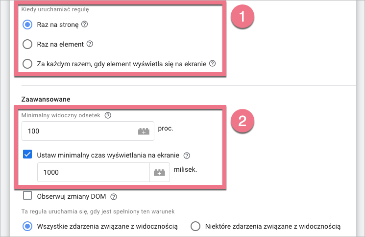 6. Wybierz, kiedy uruchomić regułę (1). Możesz także zdecydować, jaki procent elementu musi zostać wyświetlony, aby uruchomić regułę, a także minimalny czas, przez jaki musi element być wyświetlony (2).
