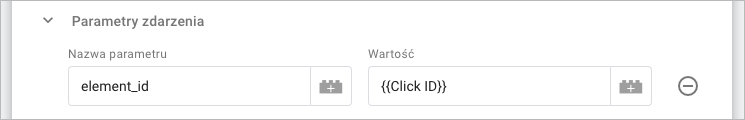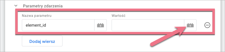 10a. Jeżeli chcesz dodatkowo śledzić po identyfikatorze elementu, dodaj Parametry zdarzenia. Aby stworzyć nowy parametr, kliknij Dodaj wiersz. Nazwij dowolne parametr, a następnie kliknij ikonę plusa obok pola Wartość.