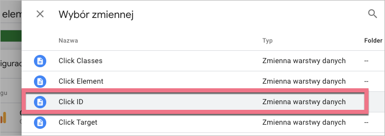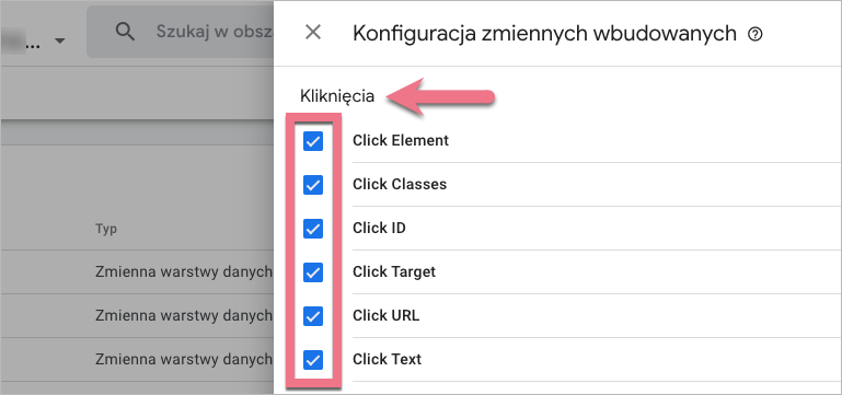 2. Znajdź Kliknięcia. Wybierz zmienne – najważniejsza w tym wypadku jest zmienna Click ID.